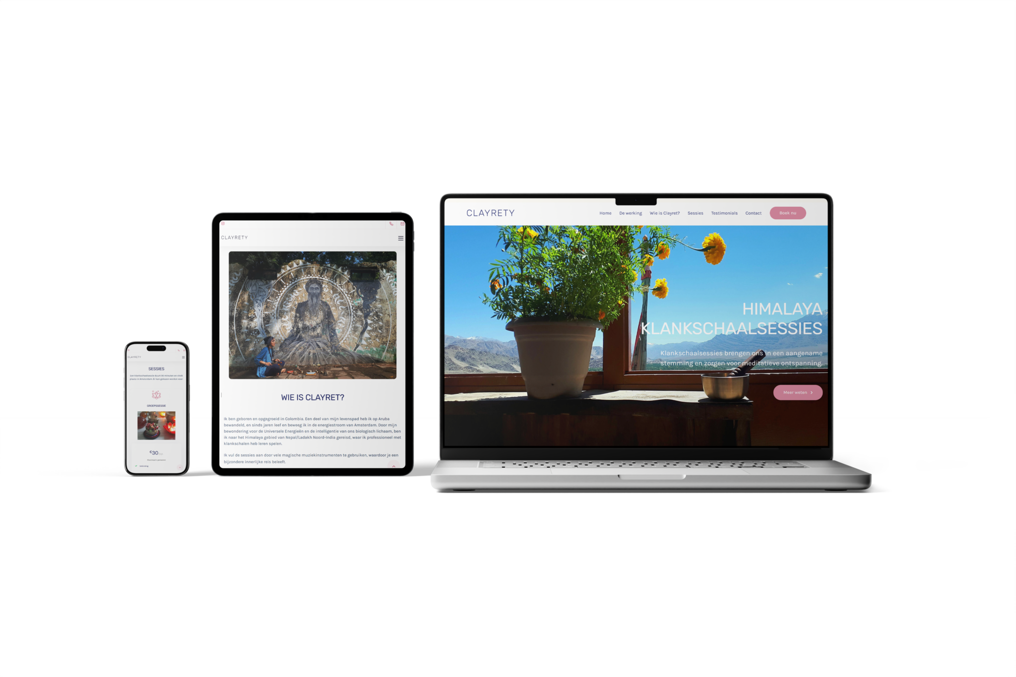 Na een prettige kennismaking zijn we gaan kijken waar Clayrety voor staat en hoe dit vertaald kan worden naar een krachtige online representatie. We zijn uiteindelijk uitgekomen op een licht en kleurrijk kleurenschema gecombineerd met prachtige foto’s die Clayret zelf heeft gemaakt gedurende haar reizen naar het Himalaya-gebied. Dit is verwerkt in de uitleg over Clayret zelf, de werking van de klankschaalsessies en het aanbod daarin. Clayret ontvangt op regelmatige basis enorm positieve feedback, die we hebben verwerkt in uitnodigende testimonials. Het resultaat is een moderne en creatieve website die aansluit bij Clayret haar persoonlijkheid en zakelijke identiteit.